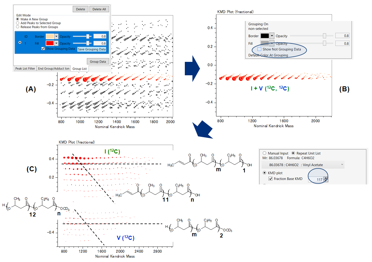 这次,我们演示了一种使用基于分数的 KMD 分析源自相同质谱但经过不同去同位素处理的峰列表的分析方法。 Fraction base KMD通过改变X的值,可以根据具有各种差异(同位素组成的差异、末端基团的组合的差异、共聚物的聚合度的差异及其组合)的系列来调整各系列之间的分离程度,从而可以根据目的进行分离。通过将使用msRepeatFinder的分组和分组系列的显示/隐藏功能相结合,可以分析更复杂的质谱。此外,通过使用板上碱分解方法作为JMS-S300 SpiralTOF™测量的预处理,还可以将其应用于高分子量聚合物。