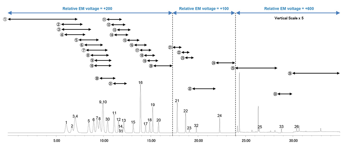 图 1 每种化合物的 pd-SIM 采集范围以及 VOC、2-MIB、土臭味的相对电磁电压条件(图中数字对应表2中的数字。)