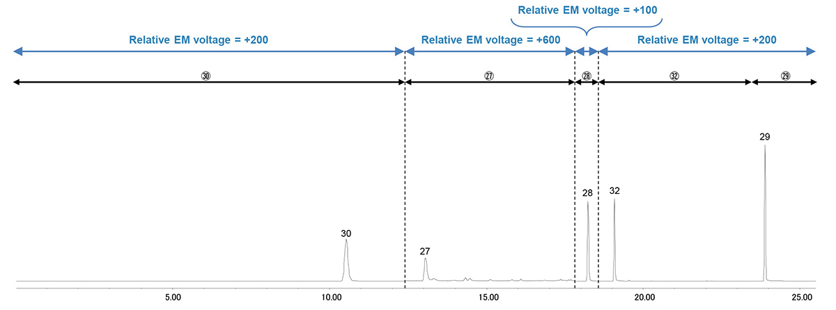 样品测量条件如表1所示,SIM监测离子如表2所示。在测量条件中,相对EM电压根据洗脱组分而变化,因为每个组分的校准曲线的浓度范围差异很大。图 1 和图 2 分别显示了在 SIM 模式下测量 VOC、2-MIB 和土臭味素以及环氧氯丙烷、苯乙烯和 1,2,3-三氯苯时每种目标化合物的相对电磁电压设置和吸收范围。此外,为了了解各条件下待测成分的洗脱位置,还显示了测量最高浓度样品时获得的SIM色谱图。