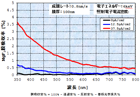 作为通过实验验证光学薄膜的吸收损耗与背向散射电子之间的相关性的方法,在本报告中,我们将在用看起来像背向散射电子的电子束照射光学薄膜的同时对其进行电子束蒸发,如图4所示。图5显示了当电子束与电子束蒸发同时照射时的MgF2显示薄膜的光谱吸收特性[2]。其中 MgF2实验中使用的原因是,它经常被用作减反射膜等光学多层膜中的低折射率材料,并且据说也是一种由于背向散射电子的入射而容易表现出吸收损失的材料。可以看出,随着电子束照射电流密度的增加,吸收率主要从可见短波长区向近紫外区增加。图。图6定量地示出了各种光学薄膜材料的吸收率与由于电子束照射而产生的电子剂量之间的相关性。2薄膜和二氧化钛2可以看出,薄膜的吸收率几乎与由于电子束照射而产生的电子剂量成正比地增加。换句话说,为了保持光学薄膜由于背散射电子的影响而产生的吸收损失较低,必须减少沉积过程中进入的背散射电子的量。