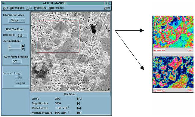 虽然用于俄歇分析的软件保持了与传统 JAMP-7800 系列的兼容性,但它现在具有一项新功能,允许在任何位置和尺寸收集俄歇图像。这使您可以在短时间内或以更高的分辨率收集目标区域的俄歇图像。 图 7 显示了通过指定区域收集俄歇图像的示例。此外,摆动鼠标功能可以在观察屏幕和俄歇分析屏幕之间进行顺畅的操作。