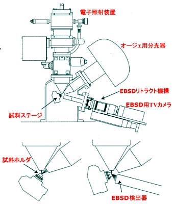 为了满足这些要求,图1显示了为JAMP-7800系列设计的样品室的外观,图2显示了横截面。该样品室的一个特点是,如图2所示,俄歇分析光谱仪和EBSD检测器都安装在样品台倾斜的方向上。通过这种布置,只需改变样品台的倾斜角度(俄歇分析约为 30 度,EBSD 约为 70 度),就可以在保持固定在与待分析视场相同的位置的同时进行俄歇和 EBSD 分析。