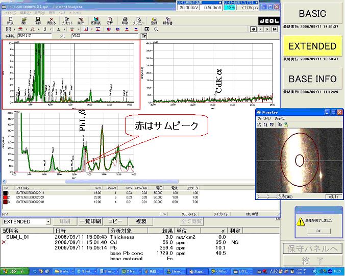 根据测量的原始数据(绿线),对底层易切削钢产生的 Fe 总和峰(红线)的重叠进行校正,并显示分析结果。