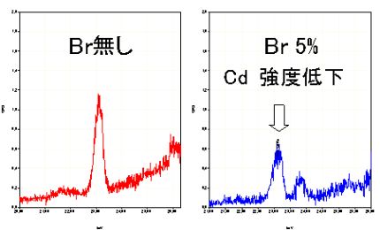 在本分析示例中,Cd 的 X 射线强度由于树脂中大量存在的 Br 的吸收而降低。通过共存元素校正,将结果校正为大于正常校准曲线值,并且更接近ICP值。