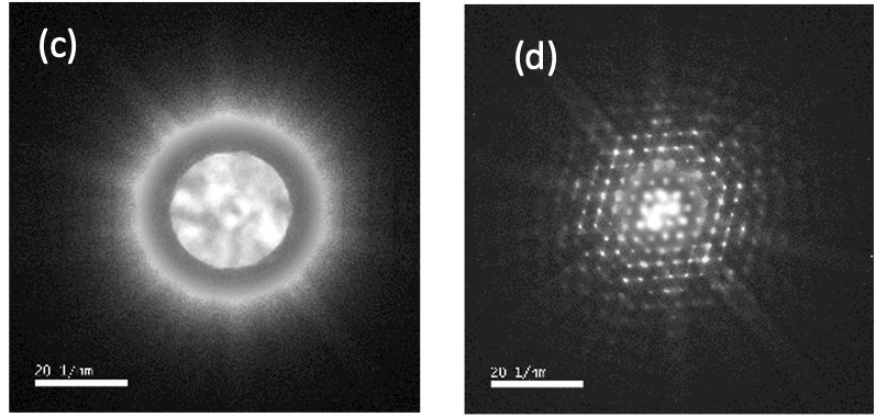 (a, c) 正常STEM观察期间(会聚角α:大)(b,d)接近平行照射且角分辨率高的条件(会聚角α:小)在实际的电子衍射图(c,d)中,外角处的高次反射强度较弱,因此在圆周上将外围部分和中心分为两部分,以调整图像的亮度。