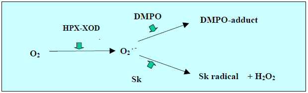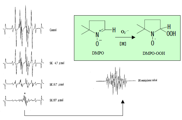 检查与活性氧的反应性时,磷酸盐缓冲液中存在的氧通过次黄嘌呤 (HPX) 和黄嘌呤氧化酶 (XOD) 的反应进行单电子还原反应。这会将氧气转化为超氧阴离子自由基 (O2. –),并在试管中与SK和捕获试剂DMPO(5,5-二甲基-1吡咯啉-<N-氧化物)反应。此时,通过保持DMPO浓度恒定并改变目标Sk的浓度,可以建立协同(竞争)反应。由于其化学结构,Sk是一种高度脂溶性的化合物,并且在使用酶反应的水溶液中,将其溶解在丙酮中并添加到缓冲溶液中。另一方面,DMPO是羟基自由基(·OH)或O2. –并使用 ESR 将它们观察为相对稳定的自由基化合物。哦2. –捕获Ya·OH的DMPO表现出不同的信号。当应用于活性氧产生反应时,这使得可以从 ESR 光谱中识别活性氧。以下是SK与DMPO之间建立合作(竞争)反应的情况。从这些光谱可以确认,DMPO加合物的ESR光谱根据Sk浓度而变化。此外,高浓度Sk的存在降低了DMPO-OOH的信号强度,并且证实了互补的Sk自由基。这是O2. –通过与SK反应而被还原,Sk通过夺取氢而转化为自由基。请注意,DMPO 会与具有强氧化性或还原性的金属和化学品发生反应,因此请小心。