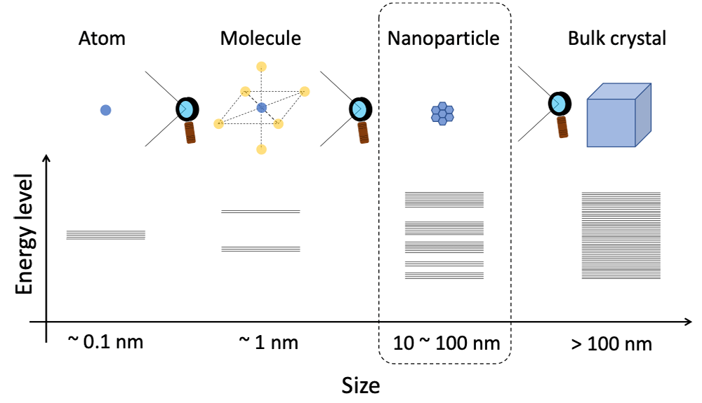 金属和半导体等块状晶体 (> 100 nm) 表现出导电性,因为电子存储在称为能带结构的连续能级中。众所周知,当这些晶体的尺寸减小到纳米区域(1 – 100 nm:介观区域)时,能级变得离散化,并且它们表现出与块状晶体、原子和分子不同的新物理特性(图1:纳米颗粒)。这种效应称为量子尺寸效应[1]。