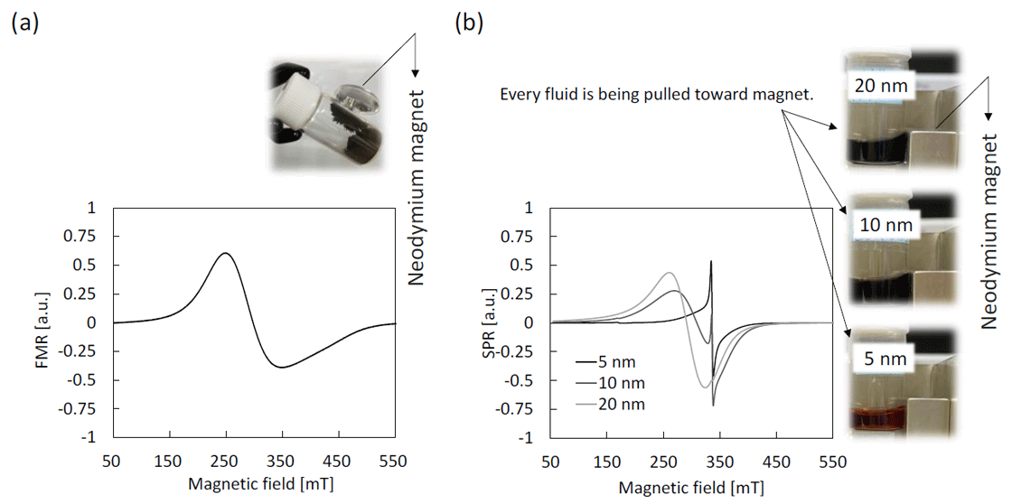 铁3O4粉末(粒径50-100 nm)和Fe的铁磁共振(FMR)谱3O4图2显示了磁性纳米粒子的甲苯分散体的超顺磁共振(SPR)谱。粒径较大的粉末具有较大的各向异性和电导率,因此观察到呈现典型戴森型线性的光谱。相比之下,磁性纳米粒子的各向异性随着粒径的减小而急剧减小,可以看到出现了全新的尖锐且各向同性的信号。这些光谱图案与大颗粒粉末的光谱图案和铁离子的顺磁共振信号完全不同,并且被认为反映了独特的依赖于尺寸的电子状态。