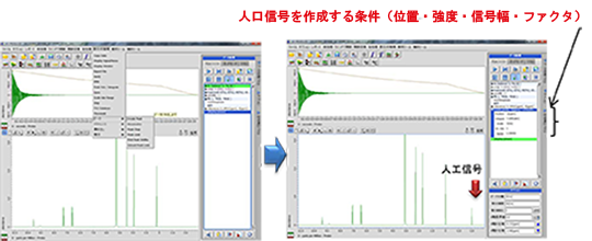 ① 将“创建峰”添加到列表中。 ② 根据参考频谱设定条件,生成人工信号。