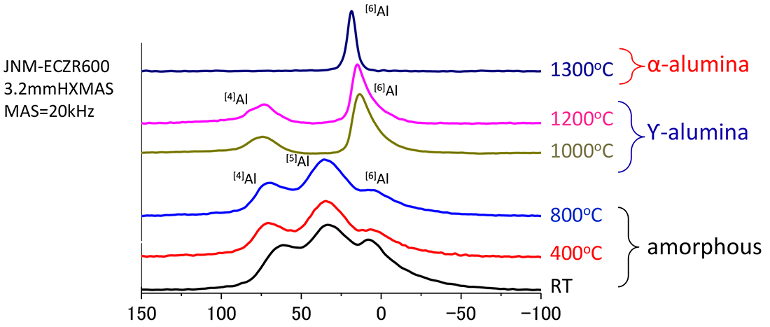 27铝化学位移/ppm硫酸中制备的阳极氧化膜以及用其热处理的样品27Al固态NMR谱。在热处理之前的薄膜中观察到源自 4-、5-和 6-配位的峰。无定形氧化铝的特征是存在许多五配位Al原子。热处理至800℃时,变为非晶态,但从1000℃开始,变为具有4和6配位的Ƴ-氧化铝晶体,在1300℃时,变为仅具有6配位的α-氧化铝晶体。像这样27Al NMR谱使我们能够知道每个结构中Al原子的配位数和丰度比。