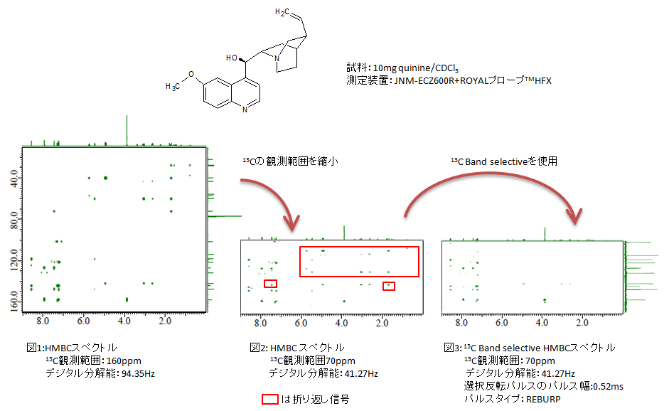 测量2D NMR时,预先测量1D NMR以了解产生信号的化学位移范围,然后仅将产生信号的范围设置为观察范围。通过这样做,您可以获得比在默认条件下测量更高分辨率的数据。 (图1)如果您想要观察的区域有限,您可以通过仅将该区域设置为观察范围来获得更高分辨率的光谱。然而,在这种情况下,观察范围之外的相关信号被观察为混叠信号,导致在频谱上检测到许多不必要的信号。 (图2)如果您想通过缩小观察范围而不产生混叠信号来提高数字分辨率,则可以通过选择性地仅激发(或反转)感兴趣的化学位移区域来获得在观察范围之外没有混叠信号的光谱。 (图3)