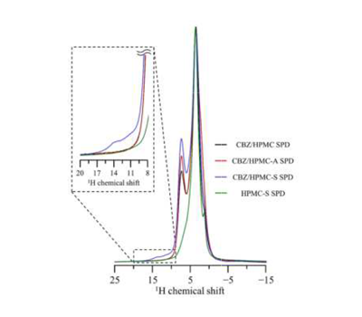 图21CBZ/HPMC、CBZ/HPMC-A、CBZ/HPMC-S 和 HPMC-S SPD 的 H 单脉冲 MAS NMR 谱。 (经参考文献 1 许可转载。版权归 2018 年美国化学会所有)