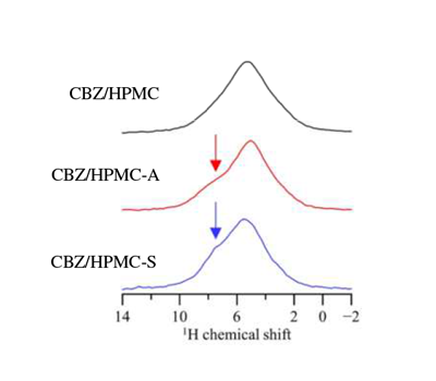 图31H-15基于 N CP 的 HSQC 过滤器1CBZ/HPMC、CBZ/HPMC-A 和 CBZ/HPMC-S 的 1H MAS NMR 谱15N-标记的 CBZ 负载量为 33 wt%。该图中的实线箭头代表新开发的峰肩。