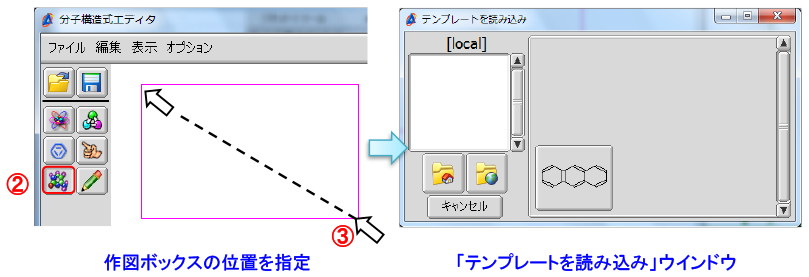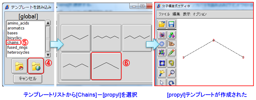 ④点击“加载模板”窗口中的[全局目录]按钮。⑤ 选择“全局”列表 - [链条], ⑥ 从“链条”列表中选择“丙基”。⇒[丙基]模板将被创建。