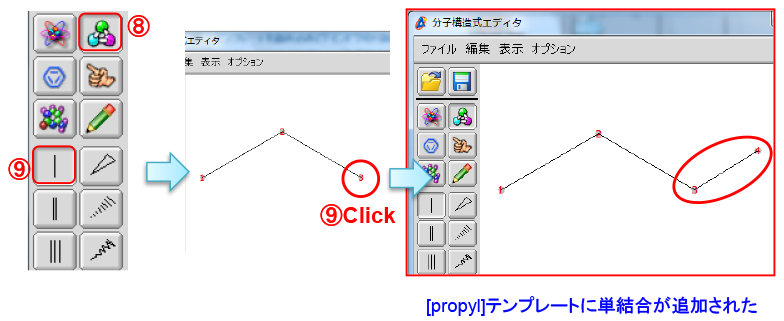 ⑧ 按[绘制债券]按钮。⑨ 按[单键]按钮,然后单击[丙基]模板的原子号3。⇒单键将被添加到[丙基]模板中。
