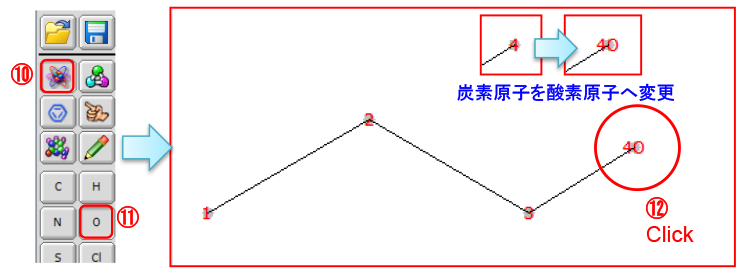 ⑩ 按[放置原子]按钮,然后按⑪[氧原子]按钮。⑫ 单击原子序数 4。⇒原子序数4(CH3)碳原子变为氧原子。