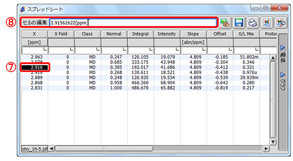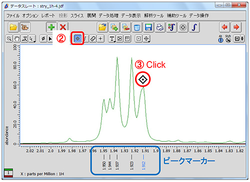 ① 在“1D Processor”窗口或“Data Slate”窗口中显示数据。② 单击指针栏上的[峰值]按钮。③ 单击峰值。