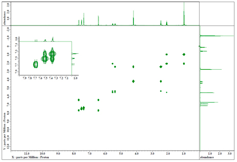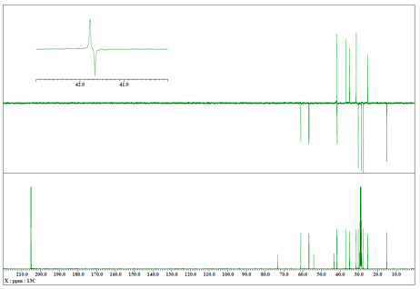 创建布局的示例如下所示。左图是1H-1H 这是一个示例,其中 COSY 光谱的 7-8ppm 区域被放大并显示在 2D 数据的左上方。右图为DEPT135谱图13C 这是在光谱数据左上方放大显示 DEPT135 光谱 40-43ppm 区域的示例。