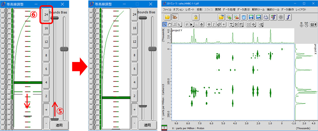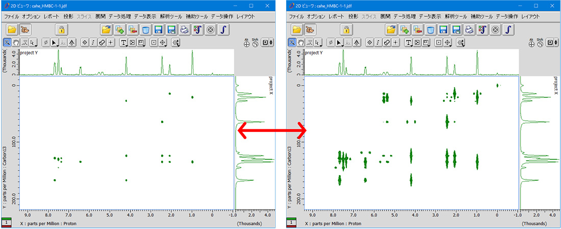 显示二维数据时,Delta 会通过确定数据的峰值阈值和噪声级别来自动调整等高线设置,以提供适当的显示。您还可以使用轮廓调整工具手动调整 2D 数据的显示。