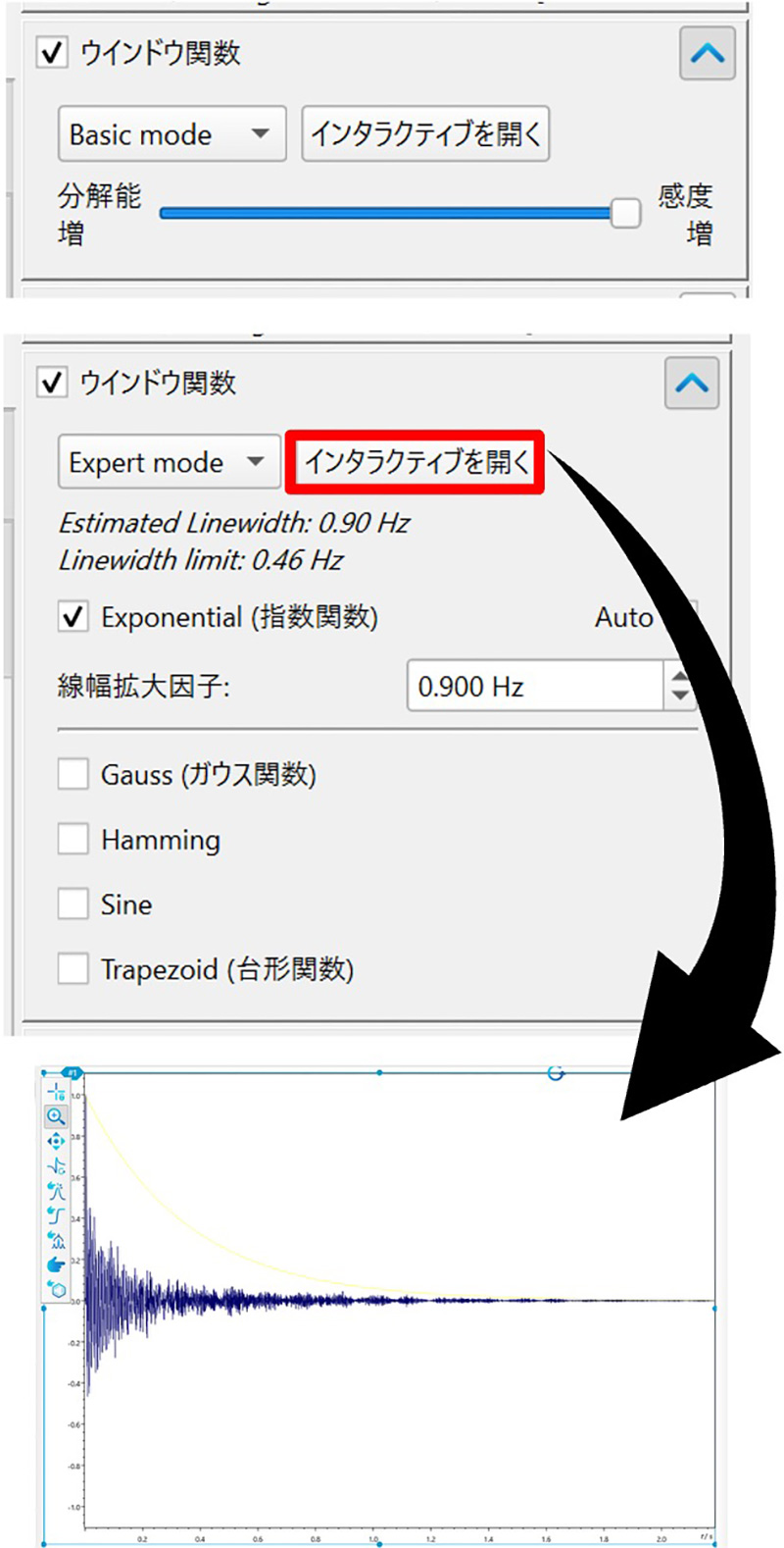 通过向左或向右移动滑块并按[应用]按钮,您可以获得强调分辨率或信噪比的频谱。此外,如果从基本模式更改为专家模式,除了指数函数之外,还可以将高斯函数、正弦函数、梯形函数或这些函数的组合设置为窗函数。您还可以在专家模式下点击【打开交互】,直观地了解FID上函数的形状。