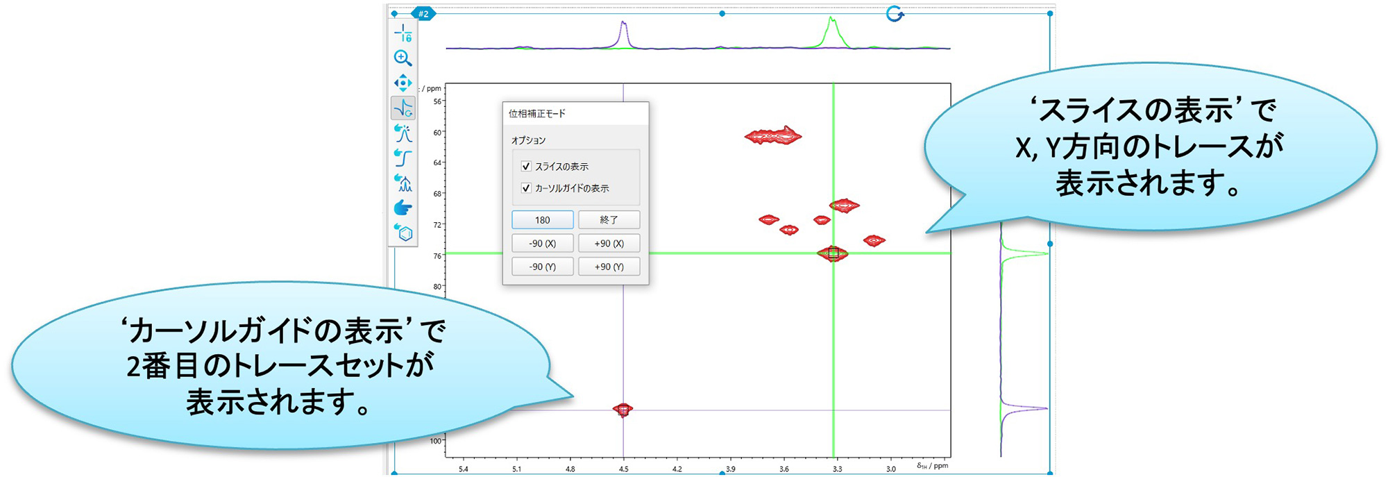 首先,点击加载数据时出现的工具栏上的[手动相位校正]按钮,切换到相位校正模式。此时,枢轴点(绿线)自动设置在最大峰值位置。可以通过左键单击并拖动线条上方的抓取框来移动枢轴点。