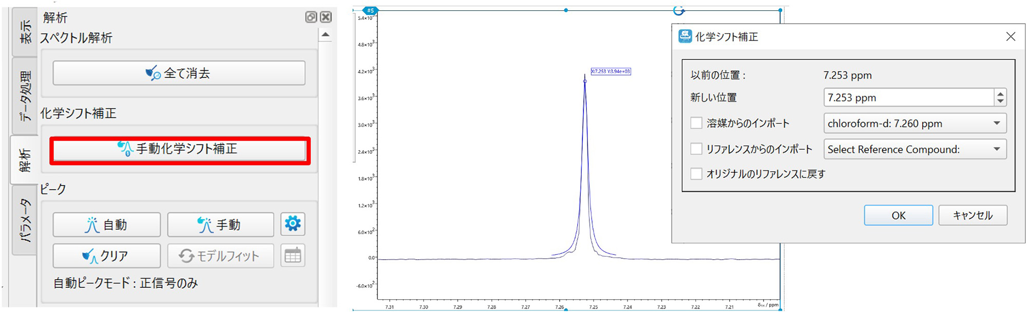 点击分析标签页上的[手动化学位移校正]按钮后,将光标移动到峰的顶部并选择该峰。选择“从溶剂导入”以匹配溶剂的化学位移,或选择“从参考导入”以匹配另一个参考(DSS、TMS、TSP:默认为 0 ppm)。