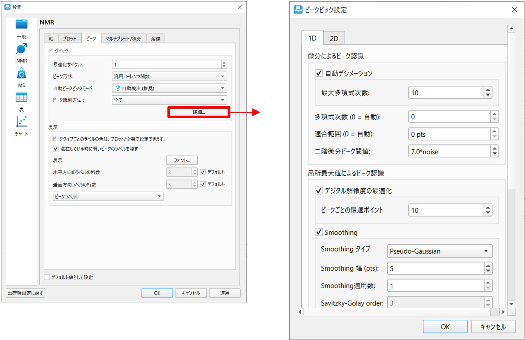 点击“分析”标签页上“峰值”最右侧的齿轮按钮,打开“设置”屏幕。在此屏幕上,您可以选择峰值形状(伪 Voigt 函数或一般洛伦兹函数)等。此外,通过从“Settings”屏幕上的“Details”打开“Peak Pick Settings”屏幕,您可以设置峰值识别条件、噪声识别条件等。