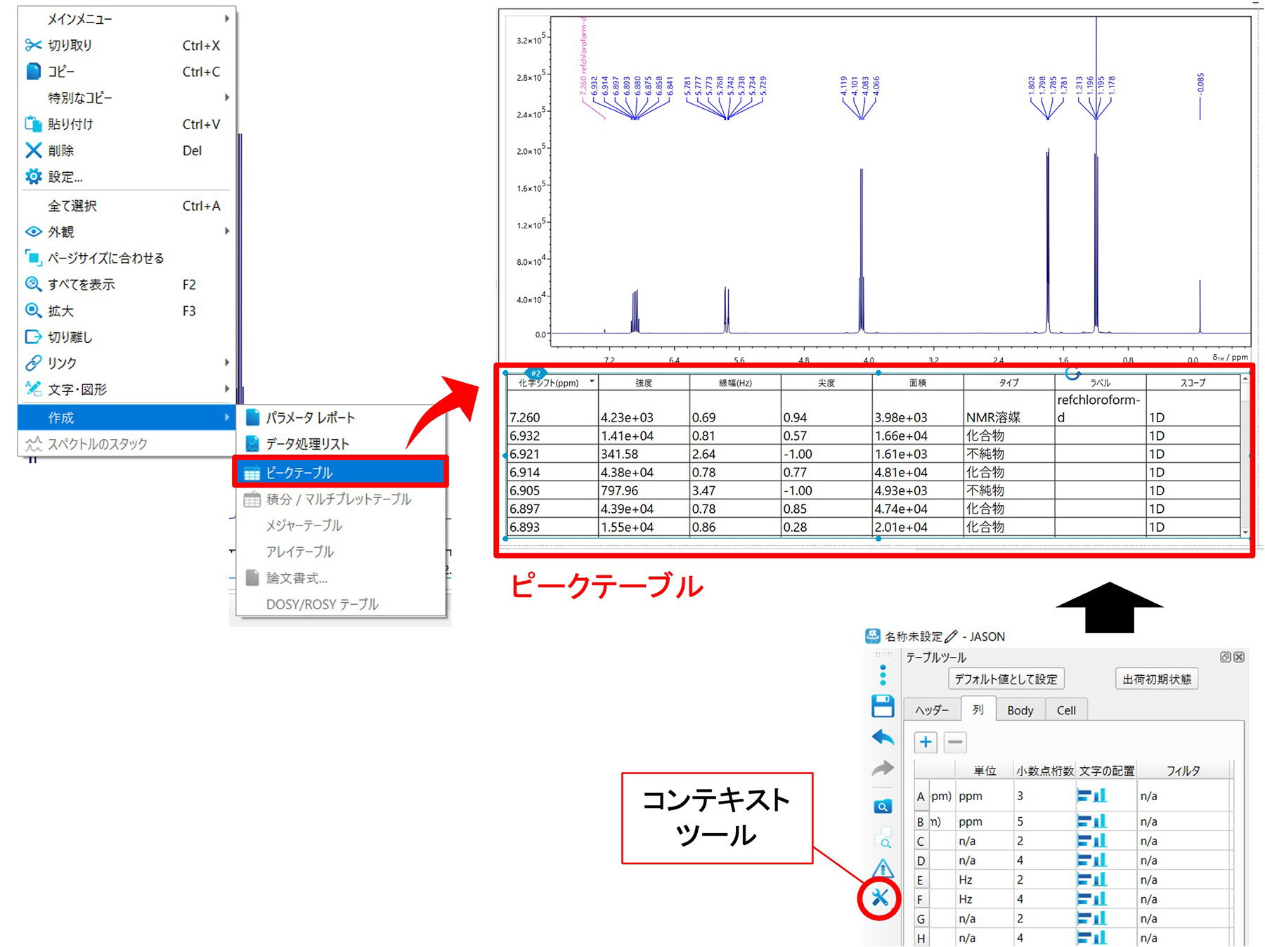 取峰后,右键单击谱图并选择[创建] ⇒ [峰表]。