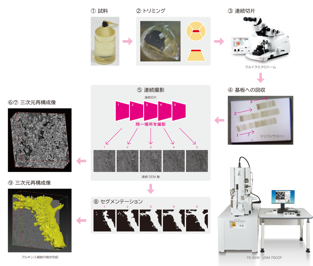 有限元扫描电镜(JSM-7900F,JEOL制造),利用阵列断层摄影法对小脑的神经组织的一部分进行三维重建。三维重建是通过堆叠小脑组织的连续切片来进行的,并对感兴趣的细胞和结构进行分割。