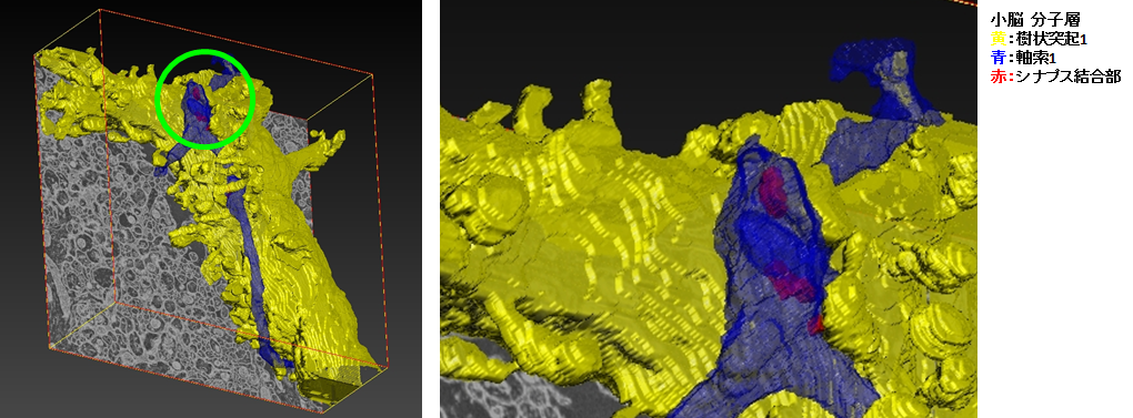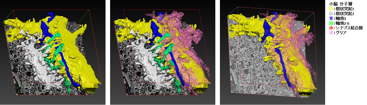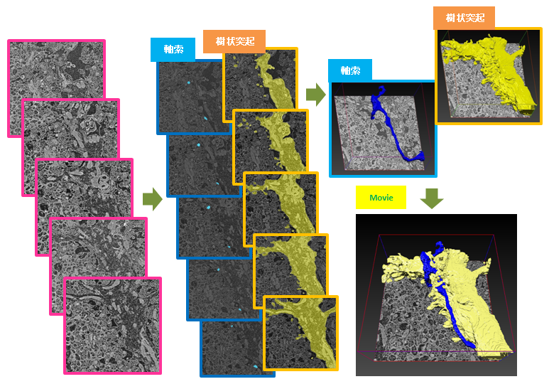使用FE-SEM(JSM-7900F,JEOL制造)的背散射电子图像(BEI),我们使用阵列断层扫描对小脑分子层中浦肯野细胞树突和轴突之间的突触周围区域进行了三维重建。三维重建是通过堆叠连续切片来分割感兴趣的细胞和结构来执行的。