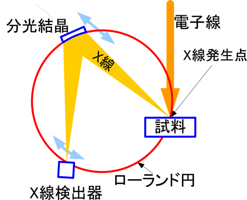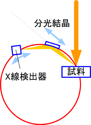 波长色散X射线光谱仪,样品上的X射线发生点与光谱仪晶体之间的距离相同,光谱仪晶体与X射线探测器之间的距离相同,以满足X射线衍射条件(布拉格条件)和几何聚焦条件。通过沿罗兰圆移动分光晶体和X射线探测器来探测不同波长的X射线。