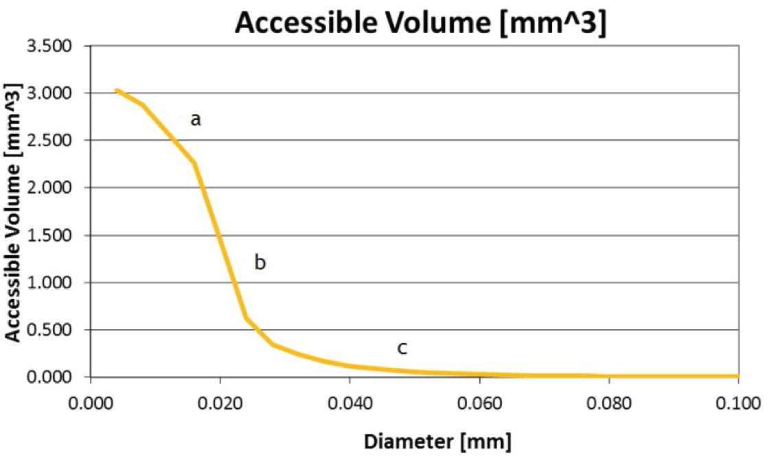 图5a显示了连续空隙中的16μ空隙。 B显示连续空隙中的24μ空隙。 C显示连续空隙中的48μ空隙。图6连续孔隙中孔隙体积和孔径之间的相关图。 (X:空隙直径,Y:连接空隙体积)