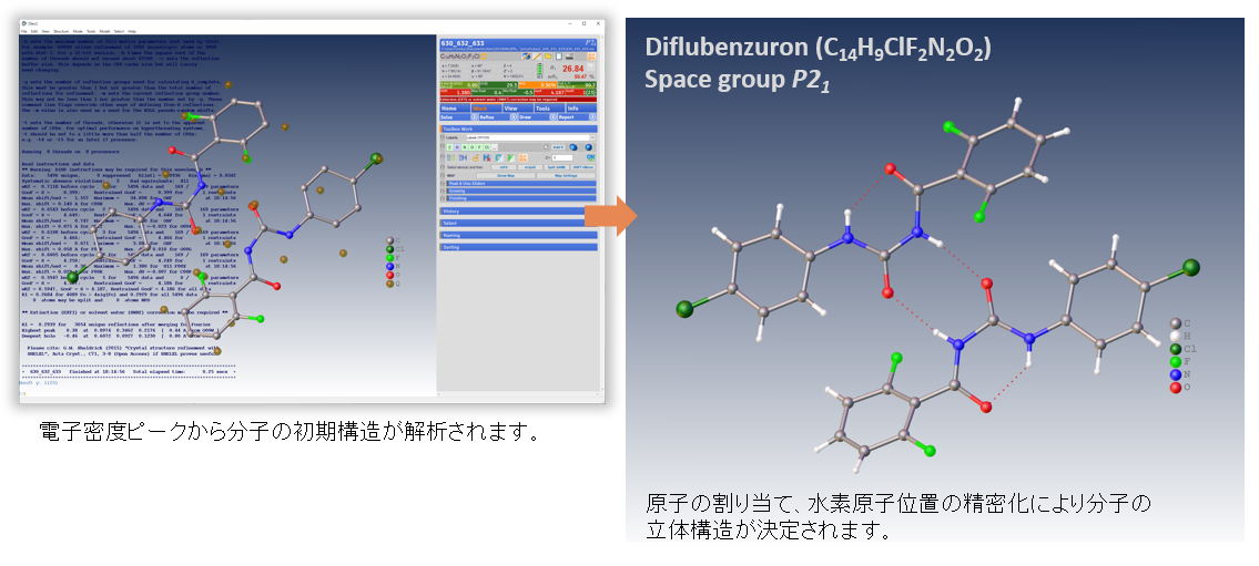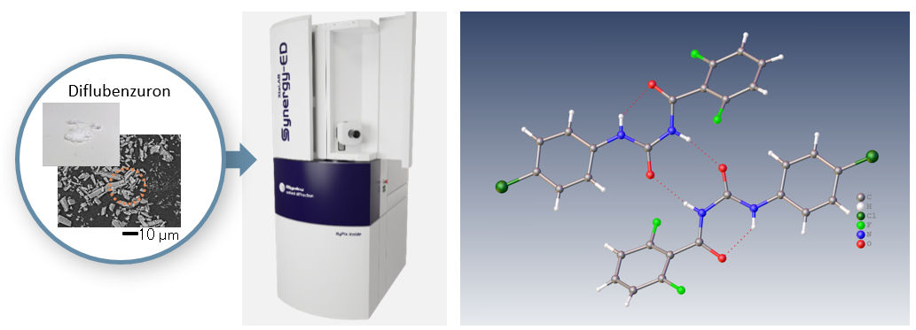 右:XtaLAB Synergy-ED 对除虫脲的电子衍射结构分析结果