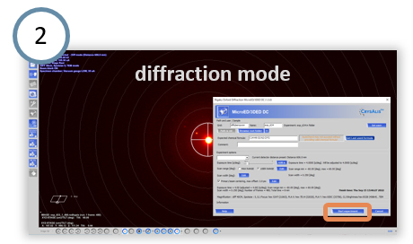 样品观察和电子衍射测量由CrysAlis进行专业版ED可以快速完成视觉模式和衍射模式之间的无缝切换。在要测量的粒子上单击鼠标,然后单击 MicroED Stage Control 菜单中的 Diffexp 按钮切换到衍射模式。单击 MicroED/3D ED DC 窗口中的“开始实验”按钮开始自动电子衍射测量。主要测量是在平台倾斜 -60 至 +60 度时进行的。