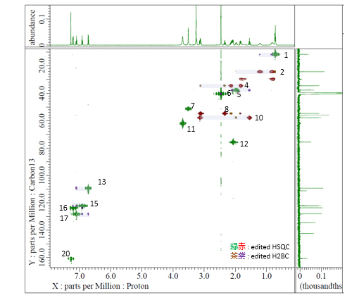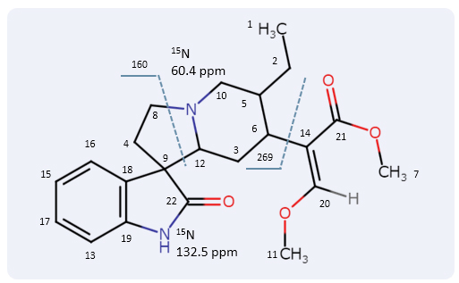 同样来自二维核磁共振测量,1H 和13C 核和1H 和15通过分析N原子核之间的联系,可以分析生物碱化合物的部分结构。通过将它们结合起来,可以估计总体分子结构。以下是钩藤碱分子的推导结构。