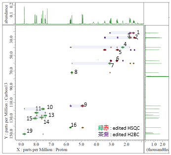 左:JNM-ECZL 500R 编辑的辛可尼定 HSQC 和 H2BC NMR 谱