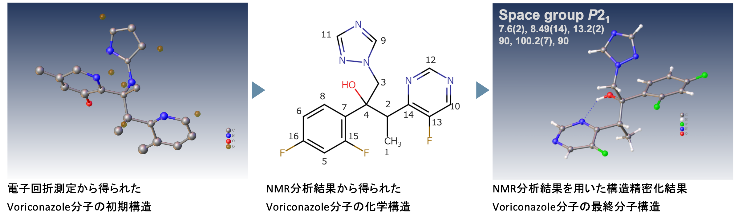 电子衍射结果可以通过使用最小二乘法的坐标精修和使用精修程序(例如 SHELXL)的分子结构分析来分析。此时,通过对分子进行建模,用户可以获得正确的分子结构,即最小值(全局最小值),同时避免最小二乘法造成的局部最小值。在此过程中,核磁共振分析结果可以提供更准确的模型并优化细化电子衍射结果的结构。左图为伏立康唑溶液1313C NMR测量结果。对于含氟化合物的分析,请使用 HF1H 和19F 的双调谐可切换 ROYAL Probe™ HFX 分析非常有效。伏立康唑含有 3 个氟,因此1H 和19解耦 F1313C NMR 测量很重要。上图中心为NMR分析结果得到的伏立康唑分子的化学结构。通过将该结构应用于通过电子衍射获得的初始结构,可以有效地细化该结构。