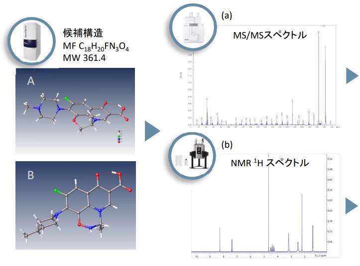 XtaLAB Synergy-ED 可以对粉末状样品(例如药物测试试剂)在其原始状态下进行电子衍射结构分析。此外,通过将其与使用日本电子的质谱仪(MS)和核磁共振(NMR)的精确化学结构分析相结合,可以对亚微米晶体进行更优化的分子结构分析。图 1 显示了左氧氟沙星的 3D 分子结构分析工作流程。可以通过实际获得的MS数据和NMR数据的比较分析来选择最佳候选结构。此处,根据候选结构计算11H NMR谱并测量1H 候选结构可以从NMR谱的一致性评价中选择。下面,在结构分析工作流程中,Cosmic Truth (CT) 软件提供的量子力学谱分析 (QMSA)1H 我们将介绍使用 H 迭代全自旋分析 (HiFSA) 结果的分析示例。1,2