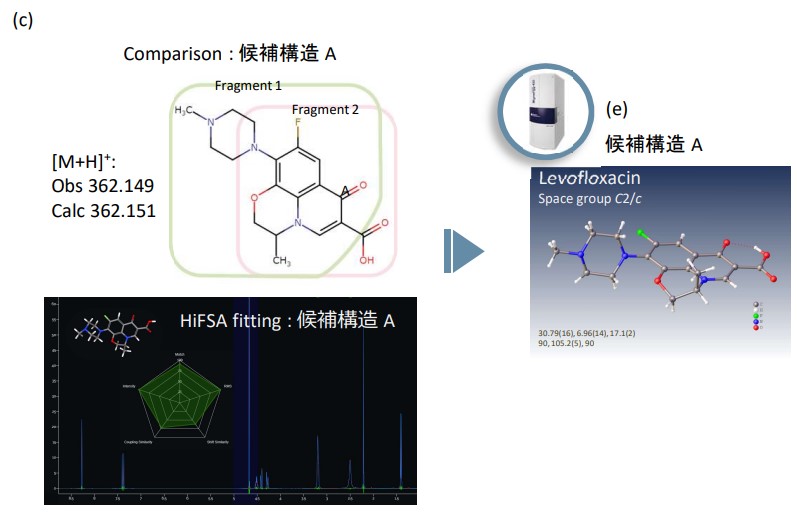 图 1。左氧氟沙星三维分子结构分析工作流程JMS-S3000 SpiralTOF™-plus 20 (a) MS/MS 谱图,JNM-ECZL 500R (b)11H NMR谱,(c)候选结构A的MS分析结果和HiFSA拟合结果,(e)XtaLAB Synergy-ED的电子衍射结构分析结果