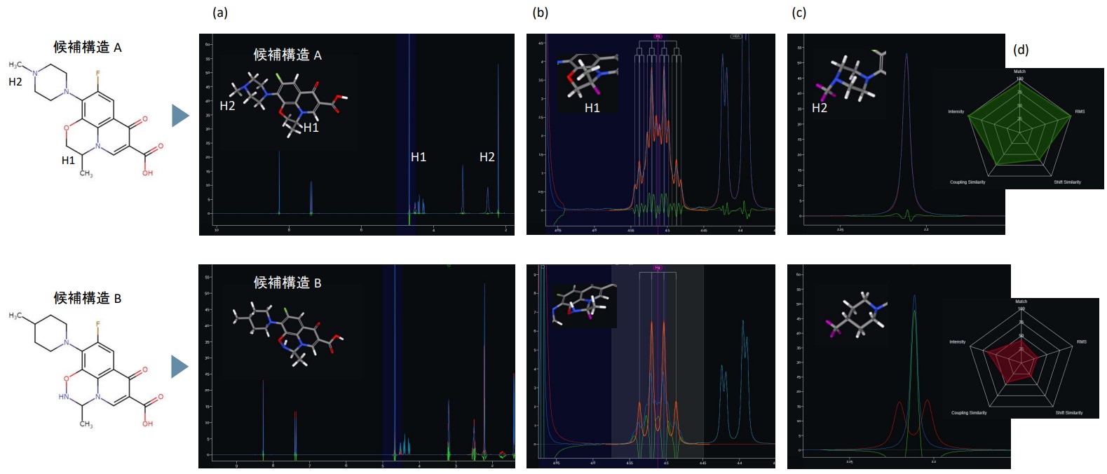 图 2。左氧氟沙星的CT HiFSA拟合结果通过 CT HiFSA 拟合从候选结构计算11H NMR谱并测量11H NMR谱图一致性评价(a)0-10ppm(b)H1峰放大图像,蓝色:实际谱图,红色:计算谱图(c)H2峰放大图像(d)一致性评价结果