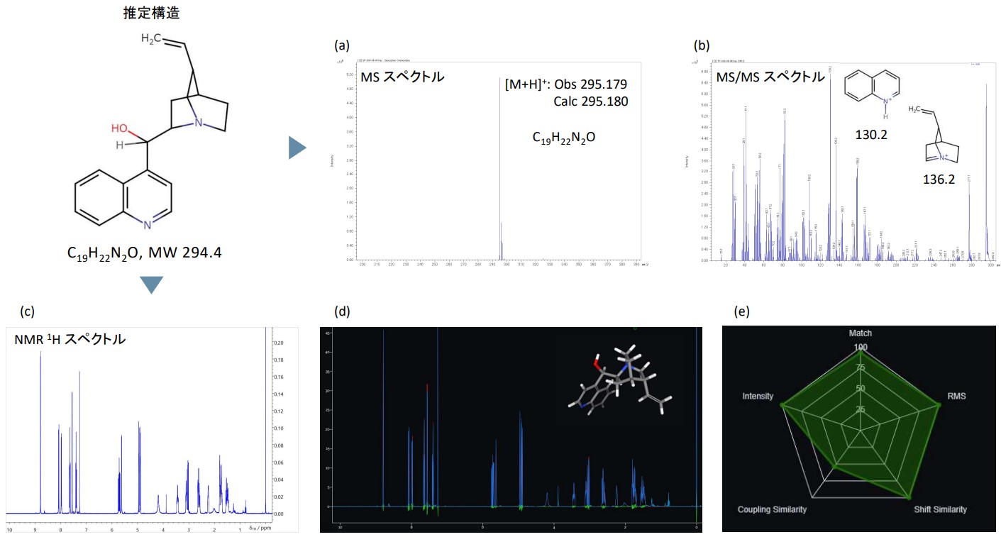 图3显示了使用辛可尼丁质谱仪JMS-S3000 SpiralTOF™-plus 20进行分析、使用JNM-ECZL 500R进行NMR分析以及使用XtaLAB Synergy-ED进行组合分析的结果。分子式和结构可以根据基质辅助激光解吸电离飞行时间质谱(MALDI-TOFMS)获得的精确质量分析结果(图3(a))和MS/MS谱图(图3(b))来估计。还测量1H NMR谱(图3(c))和CT HiFSA拟合的一致性评估,可以与MALDI-TOFMS结果一起评估估计分子结构的一致性(图3(d)和(e))。图 3(f) 显示了辛可尼丁亚结构导致的复杂自旋-自旋耦合的 CT HiFSA 拟合结果。即使对于复杂的子结构也能获得与实际光谱的良好一致性。通过使用 CT HiFSA 拟合,即使在复杂的 NMR 数据中也可以分析与结构的相关性。图3(f)显示了MS-NMR分析和XtaLAB Synergy-ED分析相结合获得的分子结构分析结果。利用合并的 MS-NMR 分析结果,我们精炼了从 XtaLAB Synergy-ED 获得的电子衍射结果的结构。