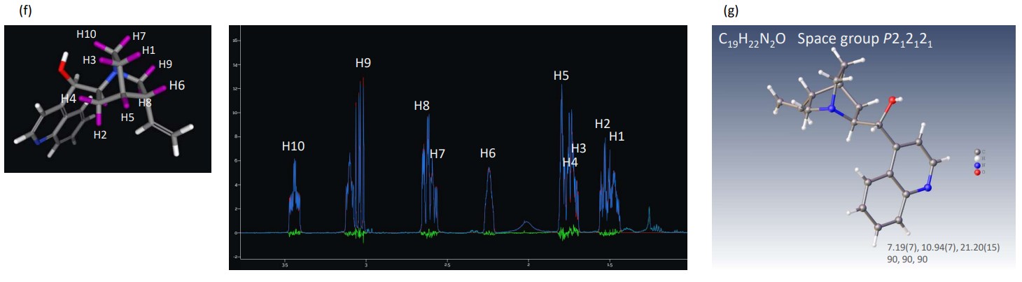图 3。辛可尼丁三维分子结构分析结果(a) MS 谱图和 (b) JMS-S3000 SpiralTOF™-plus 20 的 MS/MS 谱图,(c) JNM-ECZL 500R 的 MS/MS 谱图11H NMR谱图,(d) CT HiFSA拟合结果谱图,(e)一致性评价结果,(f)辛可尼丁亚结构CT HiFSA拟合结果,(g) XtaLAB Synergy-ED电子衍射结构分析结果