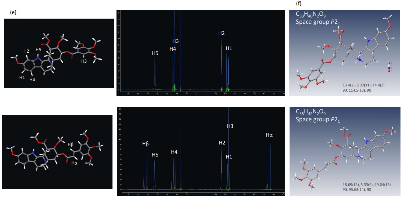 图 4。利血平和瑞西那明的三维分子结构分析结果JMS-S3000 SpiralTOF™-plus 20 (a) 利血平 MS/MS 谱图,(b) 利血平 CT HiFSA 拟合结果,(c) Rescinnamine MS/MS 谱图,(d) Rescinnamine CT HiFSA 拟合结果,(e) CT HiFSA 拟合结果 62-78 ppm,(f) XtaLAB 电子衍射结构使用 Synergy-ED 的分析结果
