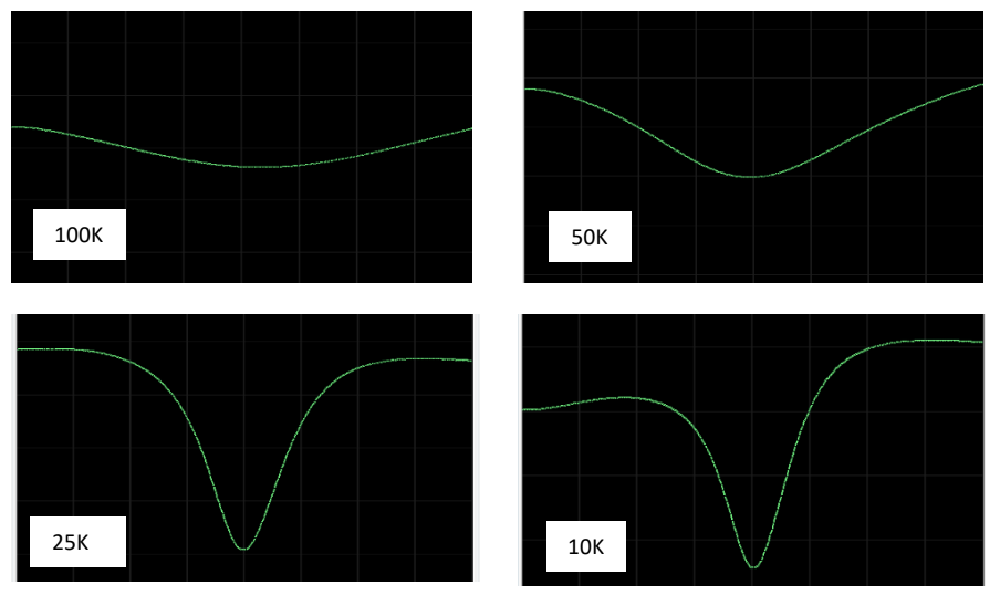 微波调整对于高灵敏度 ESR 测量非常重要。这可以通过示波器显示屏上显示的 Q 值下降形状来监控。调整Q倾角使其深而尖锐很重要,但如果样品包含许多传导电子,微波损耗将增加,并且不可能对其进行充分调整。作为一个例子,图2显示了在测量某种Q-dip形状的硅片时观察微波损耗的结果。显示了样品温度为 100K、50K、25K 和 10K 时微波调整后的 Q-dip。已经表明,灵敏度可以大约与绝对温度的倒数成比例地增加。