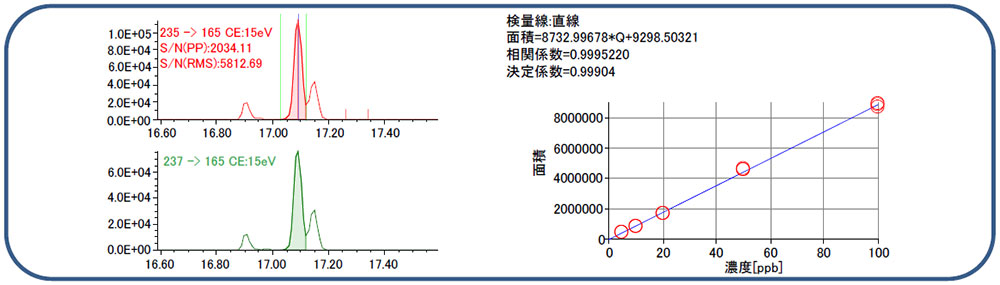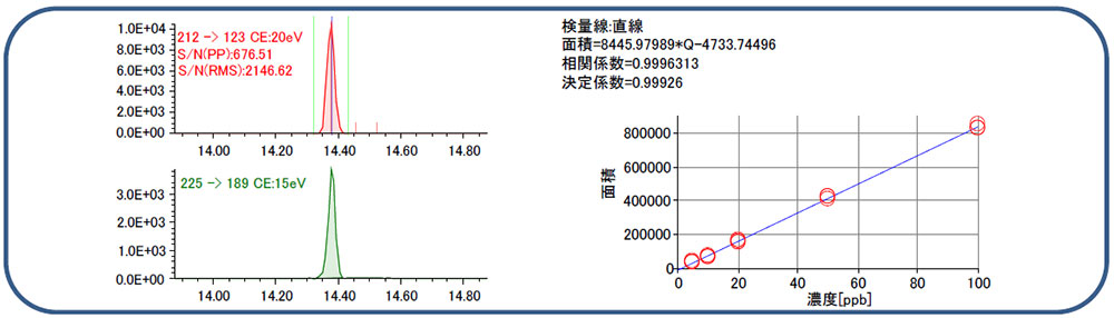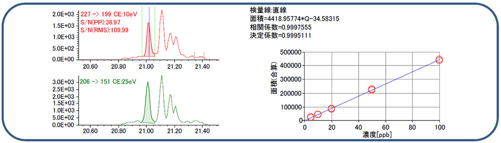 作为使用氢气载气的 GC-MS/MS 方法同时分析食品中农药残留的应用示例,在优化测量条件后,我们测量了农药混合物标准溶液,并创建了 5ppb 至 100ppb 范围内的校准曲线。在设定为测定对象的336种农药成分中,共有329种农药成分的检测浓度低至5ppb,没有出现任何问题,取得了良好的结果,此次检测的农药成分中98%可以使用氢气载气进行定量。