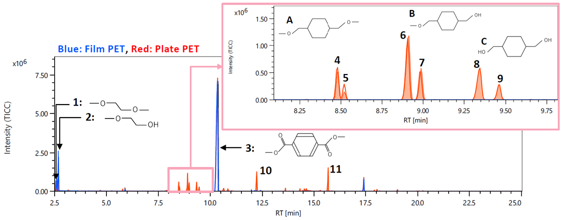 图3显示了反应热解GC-TOFMS的EI方法TICC(蓝色:膜状PET,红色:板状PET)。峰 1 至 3 被观察为两个样品的共同成分。另外,作为板状PET的特征成分,观察到峰4~11。表 2 显示了使用 msFineAnalysis AI 对平板 PET 中的峰 1 至 11 进行积分分析的结果。综合分析是利用EI谱图和FI谱图的分子离子组成推算结果,对库数据库(DB)检索结果进行综合分析,唯一确定组成式的方法。由此可知,峰1~3是作为PET的反应热分解物的对苯二甲酸和乙二醇的甲基化物。根据 DB 搜索和 FI 谱的分子离子组成估计的结果,估计峰 6 和 7 以及峰 8 和 9 是图 3 中的结构 B 和 C。虽然在 DB 搜索中没有找到峰 4 和 5 的相应化合物,但根据 EI 和 FI 谱的分子离子组成估计结果,估计它们具有结构 A。此外,由于峰4和5、峰6和7、以及峰8和9具有相同的分子式,因此推测它们是异构体。如上所述,发现峰4至9是源自环己烷二甲醇的具有不同甲基数的三种类型的反应热分解产物。还假设它们各自具有两种类型的异构体。