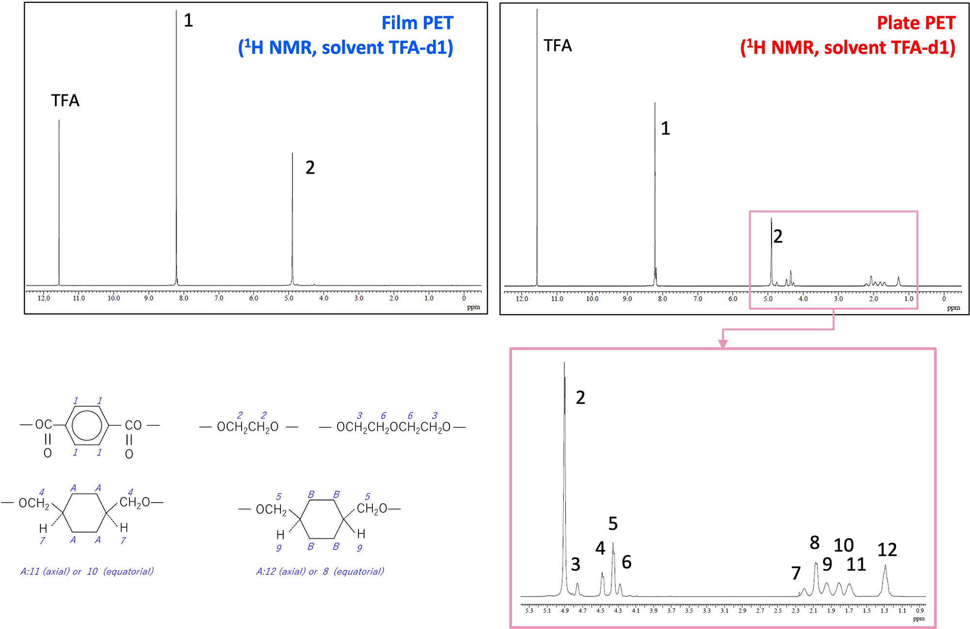 图5显示PET薄膜和PET板1H NMR 谱。在两个样品的光谱中经常观察到源自对苯二甲酸和乙二醇的峰 1 和 2。另一方面,仅在板状PET中在1~5ppm的化学位移范围内观察到多个峰(峰3~12)。根据反应热解GC-TOFMS的结果,板状PET被估计为G-PET,因此我们在PoLyInfo上搜索聚合物名称,并将列出的NMR谱与观察到的NMR进行比较,确认存在高度相似性,并指定峰。结果发现,峰3至12源自环己烷二甲醇。 NMR 谱的独特之处在于结构异构体峰被分离,从而使分析成为可能。另外,由板状PET的各峰面积值算出乙二醇与环己烷二甲醇的比率,结果约为2:1。