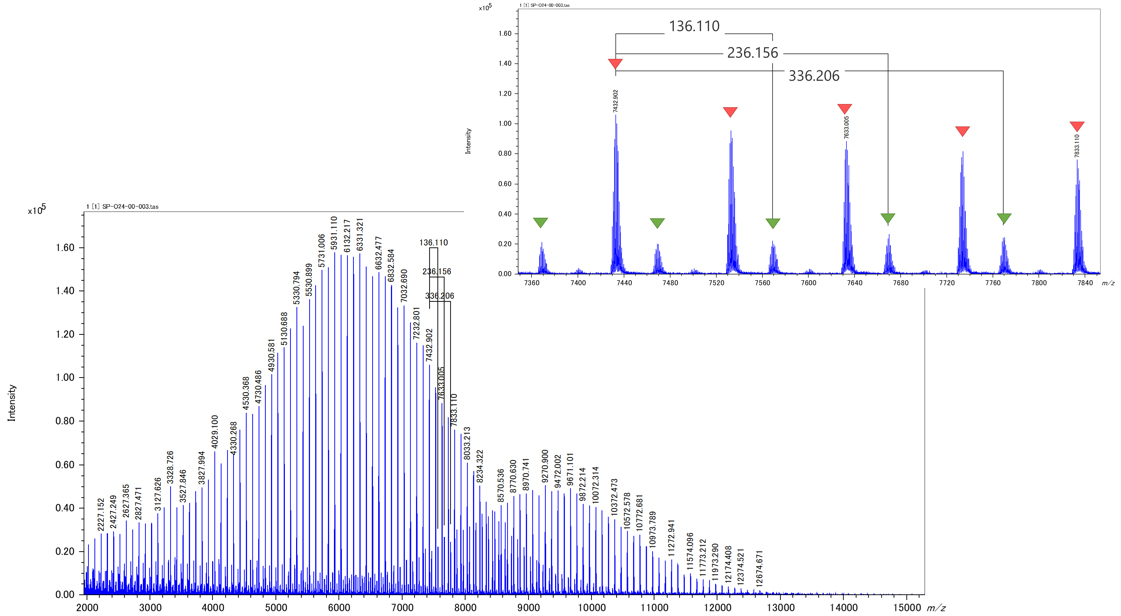 图 1 显示了通过混合 PMMA 7 kDa 和 10 kDa 测量的质谱。在 2,000 至 13,000 的分子量范围内,在质谱中观察到两种分布。m/z如果将 7350 放大到 7850,两者(Mw 7 kDa▼,分子量 10 kDa▼)是PMMA C的单体5H8O2观察到峰值由于端基结构的不同,存在质量差异。然而,由于无法从质谱中确定每个峰的聚合度,因此两者之间由于端基差异而产生的质量差相当于重复单元(C5H8O2) 出现不确定性。因此,两个端基总和的可能候选值包括 136110、236156 和 336206u。表 2 显示了根据这些质量差异估算组成的结果。根据低分子量区域端基的组成推算结果可知,PMMA 7 kDa的端基为H/H,因此在表2中添加+2H推算为PMMA 10 kDa的两个端基的总组成。