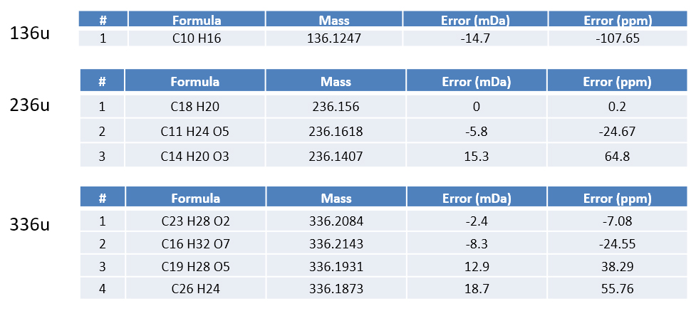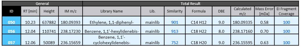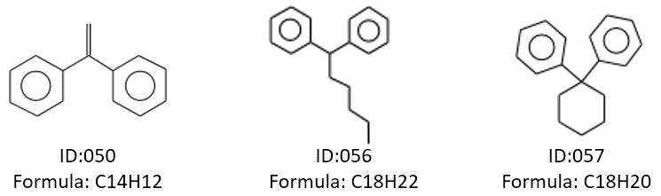 接下来显示 PMMA 7 kDa 和 10 kDa 的差异分析结果。图2(a)是EI的TICC,其中观察到单体为主要成分。接下来,图2(b)显示了10至125分钟的放大图。红色峰是PMMA 10 kDa的特征峰,观察到三个组分ID:050、056、057。这三个组分的综合分析结果如表3所示,结构式如图3所示。结合MALDI-TOFMS结果,通过C18H21/H,ID:056(ID:057)和MALDI-TOFMS之间存在236u差异,并且#1的结果(表2)显示出良好的一致性。由于ID:050是ID:056的部分结构,因此这里也不存在矛盾。即,认为PMMA 10kDa是通过使用1,1-二苯基己基锂作为引发剂的阴离子聚合来生产的。