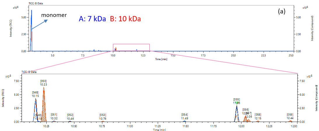 MALDI 使用软电离,因此可以将聚合物分子观察为一价离子。使用高分辨率 MALDI-TOFMS,可以根据精确质量估计端基的组成。另一方面,热解GC-TOFMS分析瞬间加热聚合物时产生的热分解产物。主要成分主要是单体和二聚体,但如果观察到含有末端基团信息的热分解产物,就可以获得末端基团的结构信息。在本报告中,我们通过互补使用MALDI-TOFMS和热解GC-TOFMS对聚甲基丙烯酸甲酯的端基进行了结构分析。